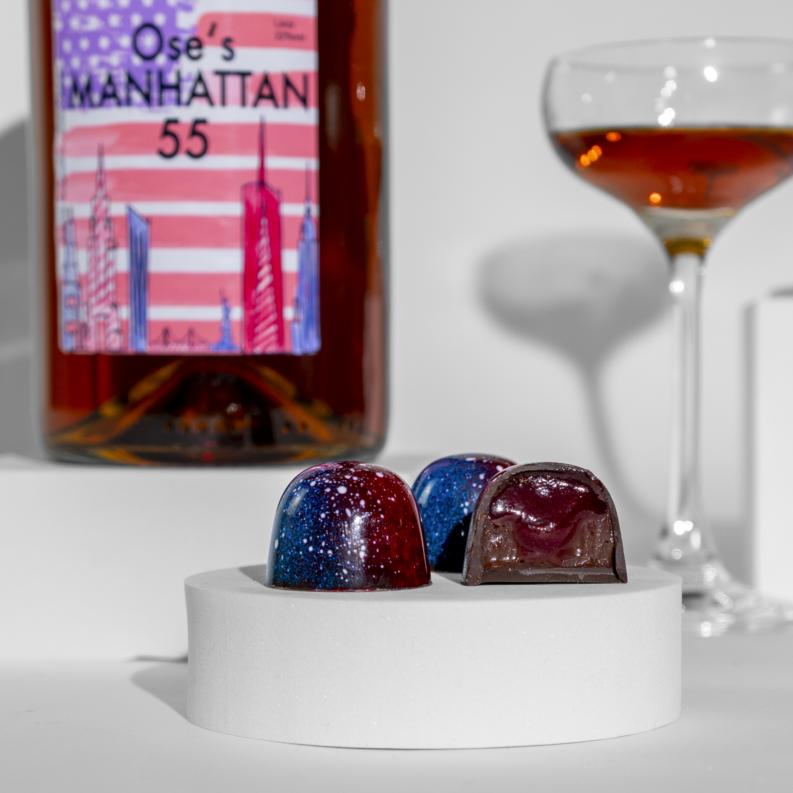 Zucker, Kakaomasse, Kakaobutter, Sauerkischpüree, SAHNE, Ose's Manhatten 55 Likör, Glukosesirup, Invertzuckersirup, VOLLMILCHPULVER, Vanilleextrakt, Geliermittel: Gelbbandpeltin; Emulgator: SOJALECITHIN, Citronensäure, Farbstoff: E122, E133, E172, E555, E170