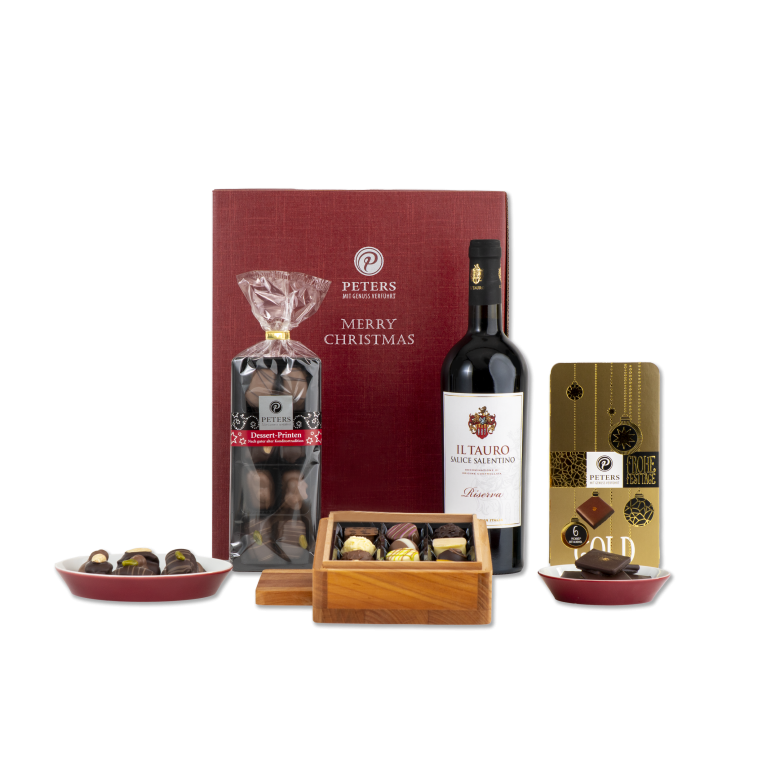 Verschenken Sie eine erstklassige Auswahl an Schokoladenspezialitäten in Harmonie mit einem besonders edlen Rotwein. Diese dunkelrote Kartonage präsentiert die enthaltenden Produkte auf eine höchst anmutende Weise – darunter die beliebte Bentobox aus Kirschbaumholz. Die Pecarée sind eine Verführung der zartbitteren Art mit echtem Gold. Die saftigen Printen erhalten durch die Gewürze eine ganz besondere weihnachtliche Note. Ausgeschmückt mit je zwei Weihnachtspralinenkugeln in verschiedenen Geschmacksorten machen das Präsent perfekt.